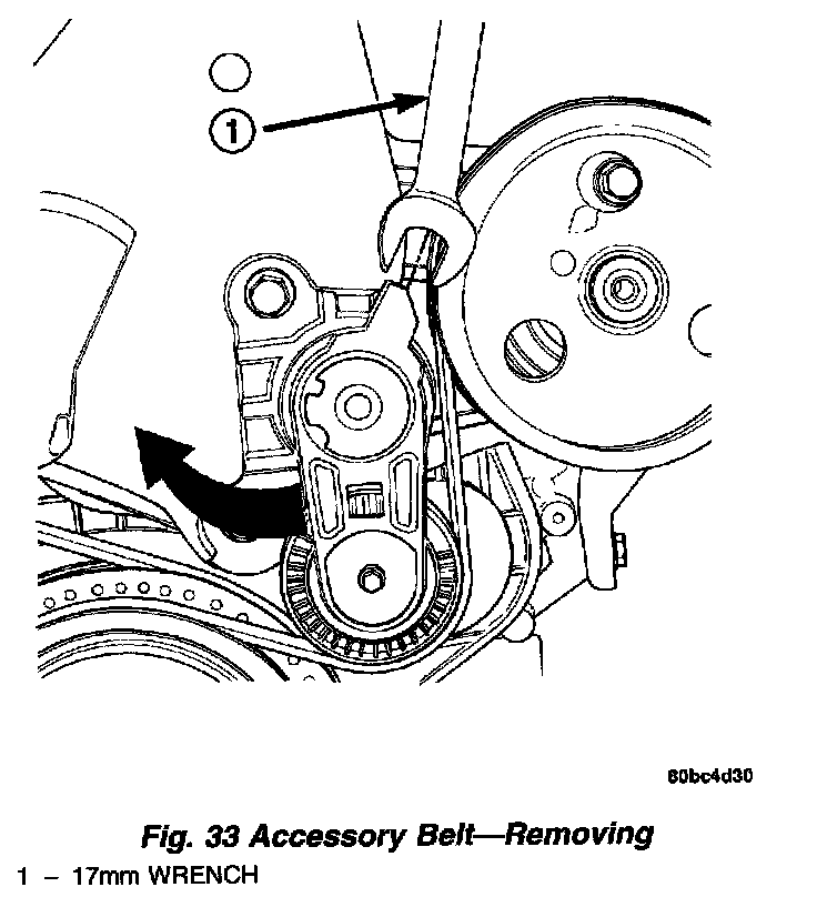 2. Using a 17 mm wrench, rotate belt tensioner clockwise (Fig. 33) until belt can be installed onto power steering pulley. Release spring tension onto belt.