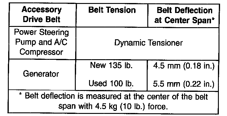 NOTE: Due to space limitations, the use of a belt tension gauge is limited. Therefore, measure the belt deflection at the center span of the generator belt. Refer to Belt Tension Chart for specifications.