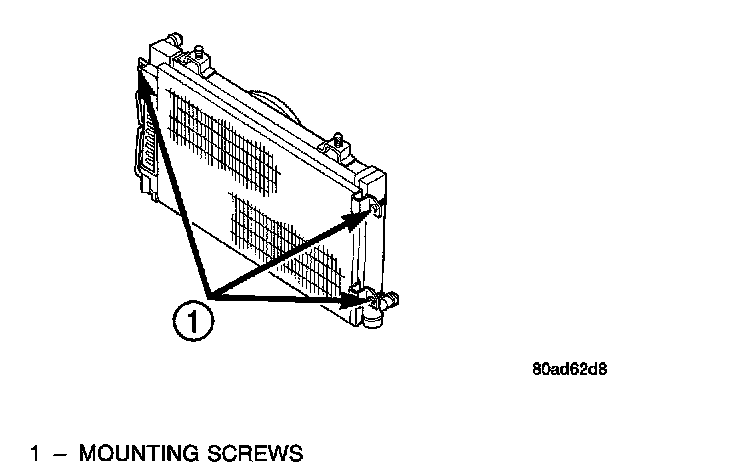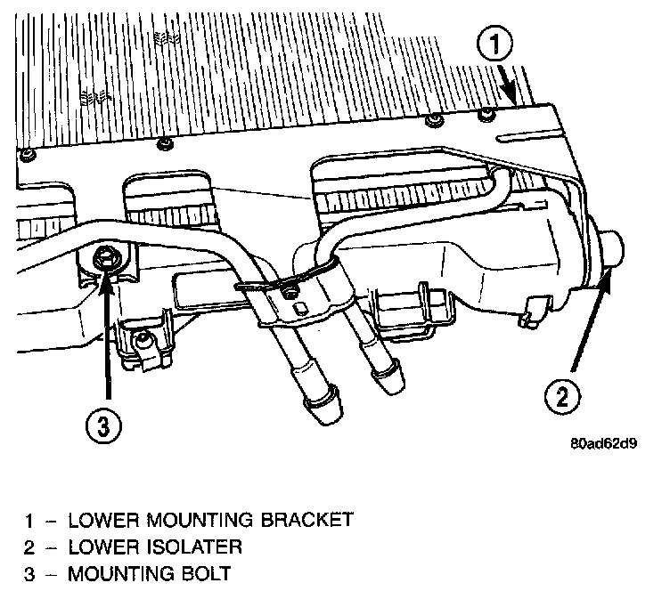 7. Lift radiator out of lower mounting brackets. Condenser lower mounting bracket is trapped between the radiator lower isolator and plastic radiator tank pin. It is necessary to lift radiator and push down on condenser to free condenser bracket from radiator pins.