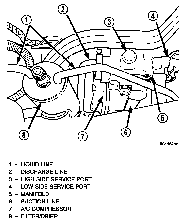 Both of the service ports to charge the air conditioning system are located on the compressor. New design of service ports have been used to ensure that the system is not accidentally filled with the wrong refrigerant (R-12).
