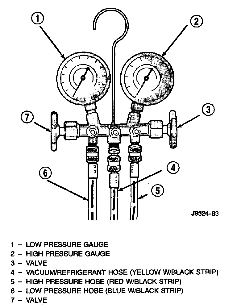 A manifold gauge set must also be used in conjunction with the charging and/or recovery/recycling device. Only use gauges that have not been used for R-12. The service hoses on the gauge set should have manual (turn wheel) or automatic back flow valves at the service port connector ends. This will prevent refrigerant R-134a from being released into the atmosphere.