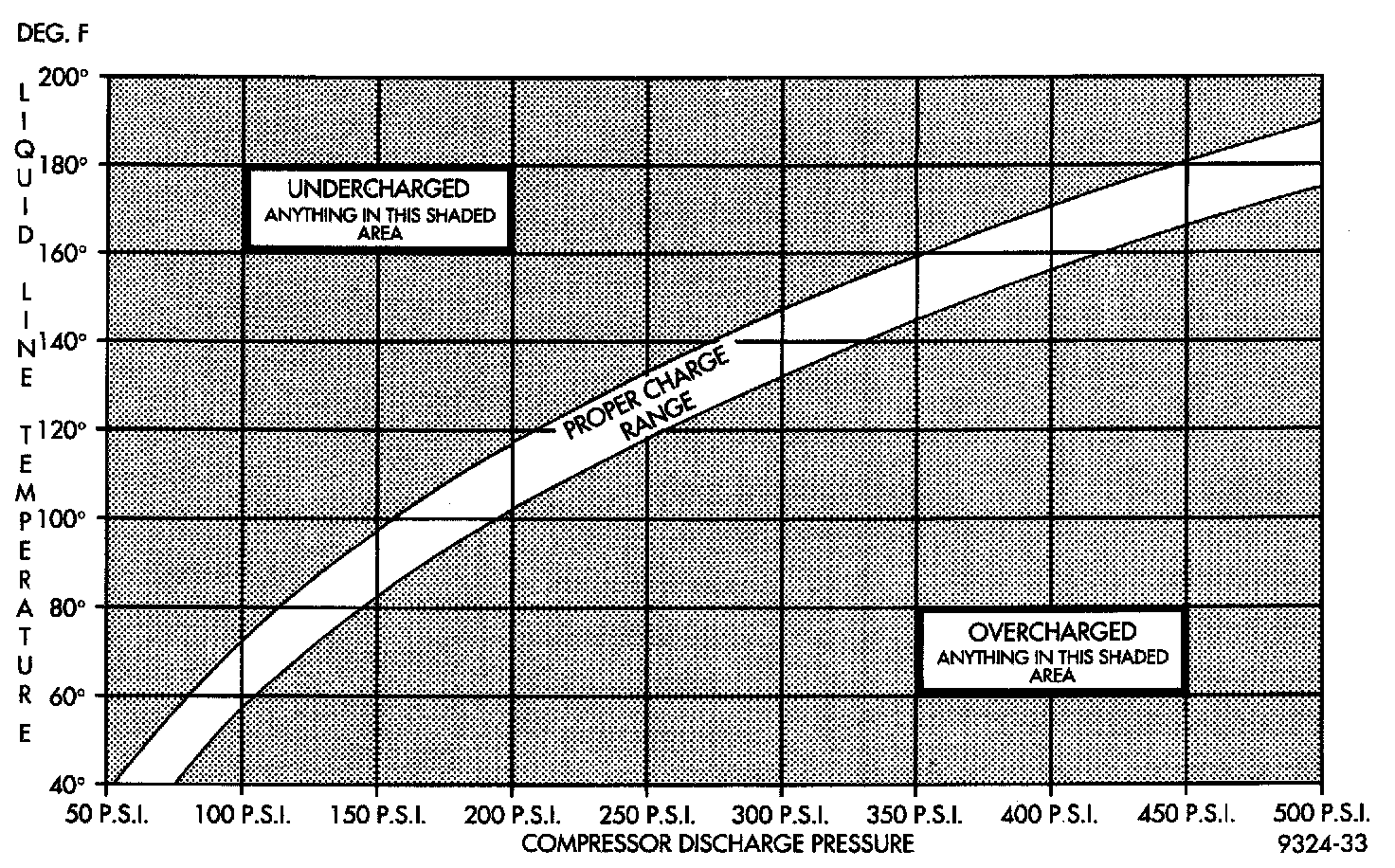 6. Observe Discharge pressure and Liquid line temperature. Using the Charge Determination Graph Chart determine where the system is currently operating. If the system is in the undercharged region, ADD 0.057 kg (2 oz.) to the system and recheck readings. If the system is in the overcharged region, RECLAIM 0.057 kg (2 oz.) from the system and recheck readings. Continue this process until the system readings are in the proper charge area on the Charge Determination Graph Chart.