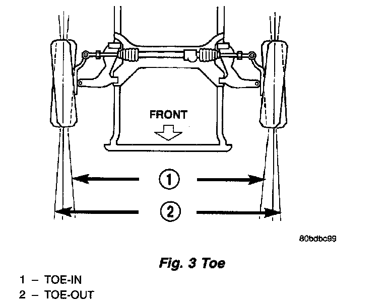 - Toe is measured in degrees or inches and is the difference in width between the centered leading and trailing edges of the tires on the same axle. Toe-in means that the front width is more narrow than the rear. Toe-out means that the front width is wider than the rear.