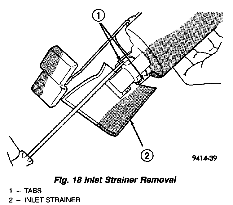 2. Using a thin straight blade screwdriver, carefully pry back the locking tabs on fuel pump reservoir and remove the strainer (Fig. 18).