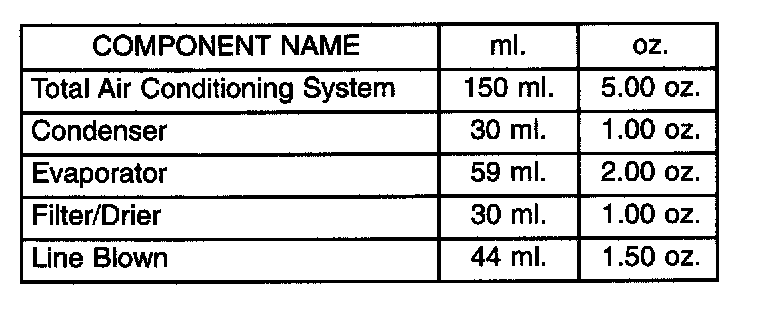 When an air conditioning system is first assembled, all components (except the compressor) are refrigerant oil free. After the system has been charged with (R-134a) refrigerant and operated, the oil in the compressor is dispersed through the lines and components. The evaporator, condenser, and receiver/drier will retain a significant amount of oil. Refer to the A/C Component Refrigerant Oil Capacities Chart below. When a component is replaced, the specified amount of refrigerant oil must be added. When the compressor is replaced, the amount of oil that is retained in the rest of the system must be drained from the replacement compressor. When a line or component has ruptured and oil has escaped, the compressor should be removed and drained. The receiver/drier must be replaced along with the ruptured part. The oil capacity of the system, minus the amount of oil still in the remaining components, can be measured and poured into the suction port of the compressor.