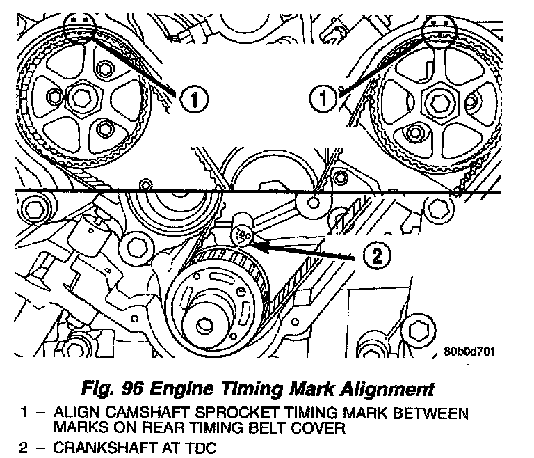 2. Align the camshaft sprockets (to reference mark made upon removal) between the marks on the rear covers (Fig. 96).