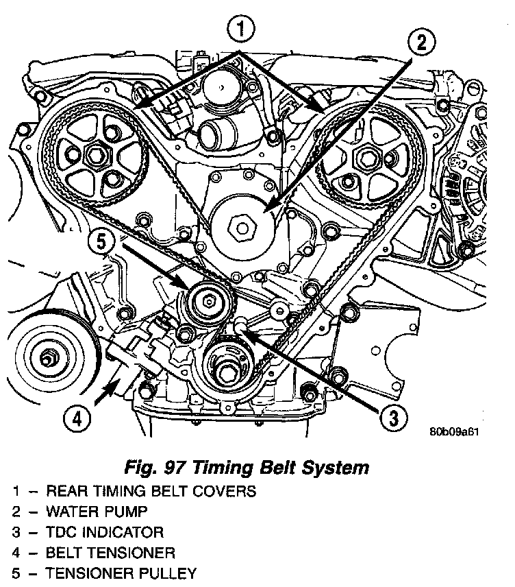 12. Start engine and allow to idle for approximately one minute. Then, preferably using a DRB III, operate the engine at speed of 1600-2000 RPM for ten minutes. This will help to bleed out any possible air in the timing belt tensioner.