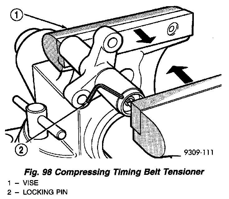 10. Remove the timing belt tensioner (Fig. 97) and remove timing belt.