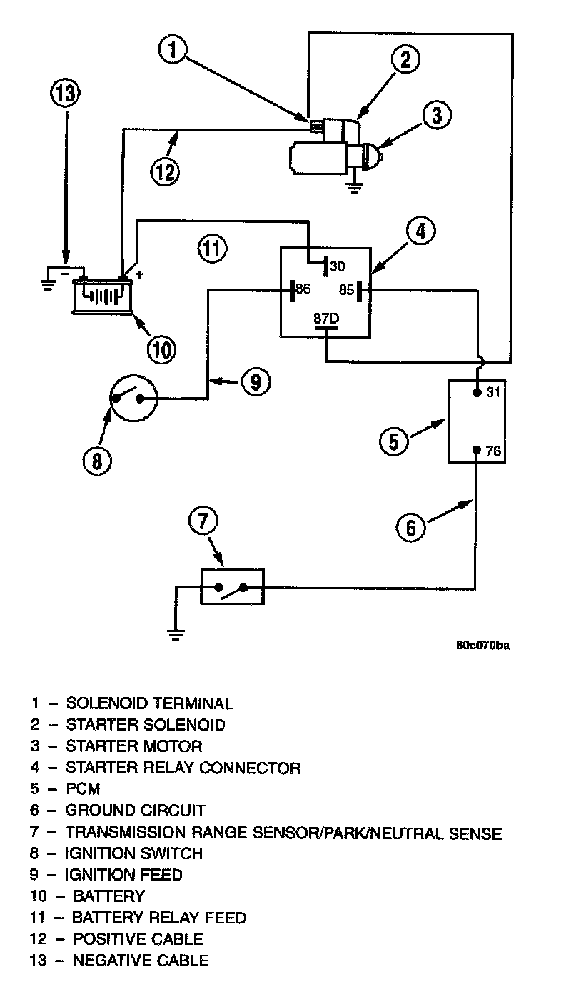 As battery power is applied to the relay from the ignition switch, battery power is applied to the starter motor through the relay to the starter solenoid.