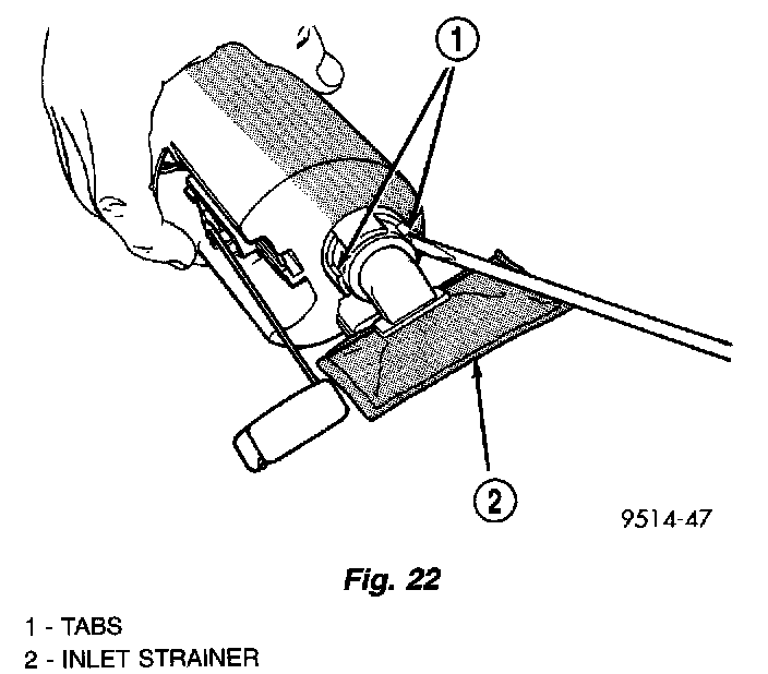 2. Using a thin straight blade screwdriver, pry back the locking tabs on fuel pump reservoir and remove the strainer (Fig. 22).