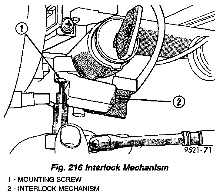5. Remove the two interlock mechanism-to-steering column attaching screws (Fig. 216). Remove the interlock housing.