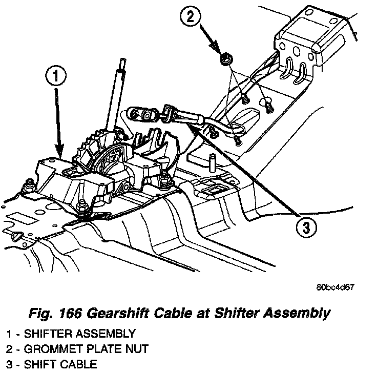7. Connect gearshift cable to shifter assembly as shown in (Fig. 166).