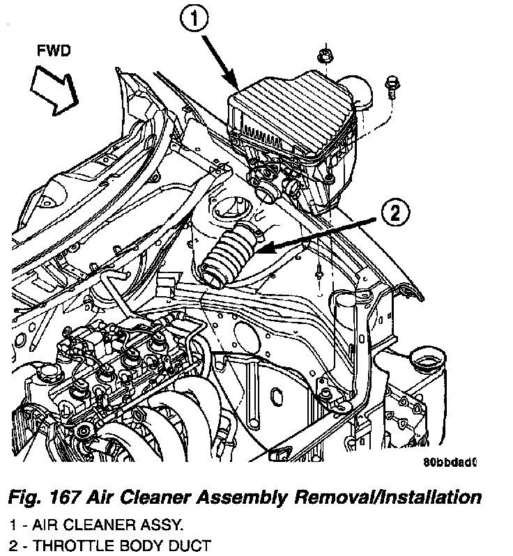 7. Remove air cleaner/throttle body assembly (Fig. 167)as follows: