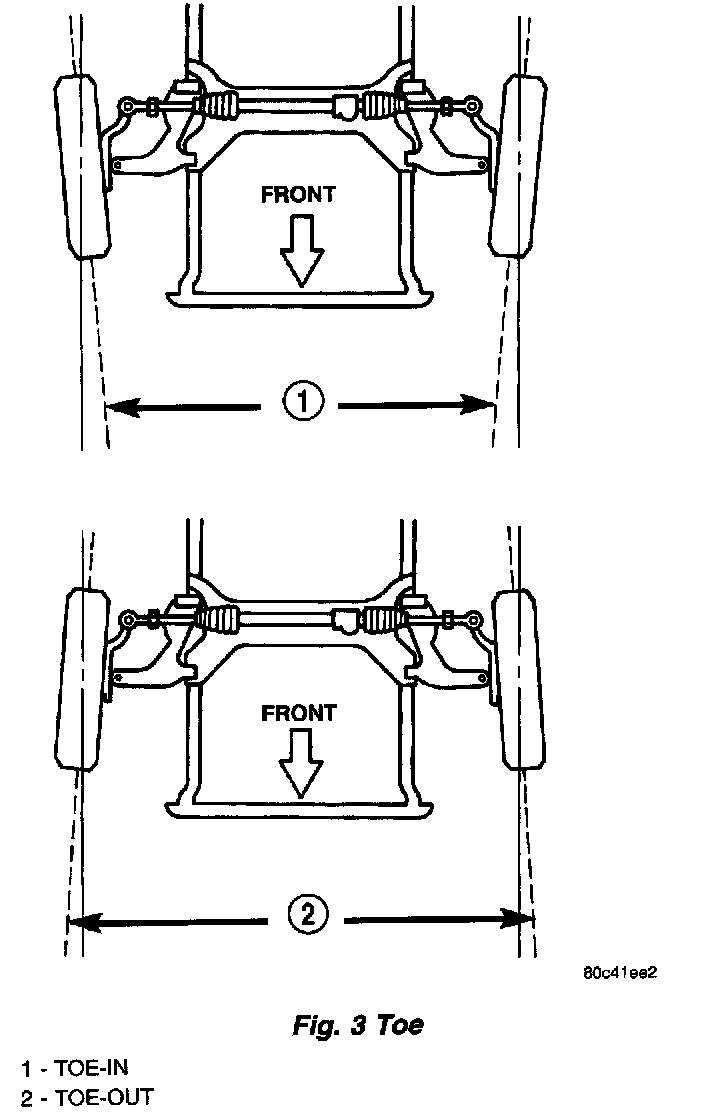 Dynamic toe pattern is the inward and outward toe movement of the front and rear tires through the suspension's jounce and rebound travel. As the vehicle's suspension moves up and down, the toe pattern varies. Toe pattern is critical in controlling the directional stability of the vehicle while in motion. Front and rear dynamic toe pattern is preset by the factory at the time the vehicle is assembled.
