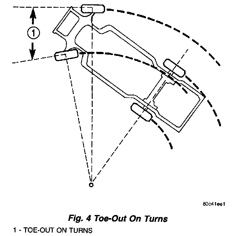 Toe-out on turns is the relative positioning of the front wheels while steering through a turn. This compensates for each front wheel's turning radius. As the vehicle encounters a turn, the outboard wheel must travel in a larger radius circle than the inboard wheel. The steering system is designed to make each wheel follow its particular radius circle. To accomplish this, the front wheels must progressively toe outward as the steering is turned from center. This eliminates tire scrubbing and undue tire wear when steering a vehicle through a turn.