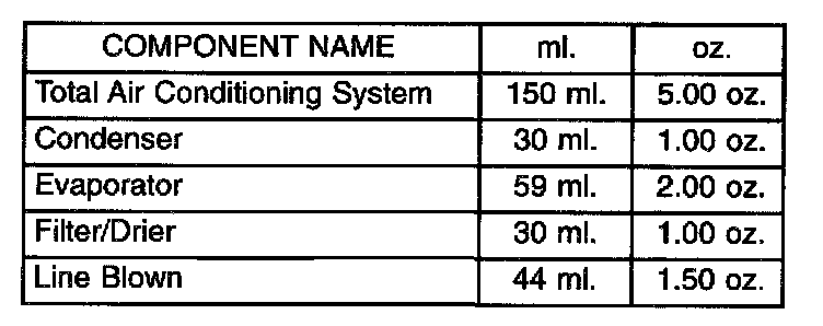 When an air conditioning system is first assembled, all components (except the compressor) are refrigerant oil free. After the system has been charged with (R-134a) refrigerant and operated, the oil in the compressor is dispersed through the lines and components. The evaporator, condenser, and receiver/drier will retain a significant amount of oil. Refer to the A/C Component Refrigerant Oil Capacities Chart below. When a component is replaced, the specified amount of refrigerant oil must be added. When the compressor is replaced, the amount of oil that is retained in the rest of the system must be drained from the replacement compressor. When a line or component has ruptured and oil has escaped, the compressor should be removed and drained. The receiver/drier must be replaced along with the ruptured part. The oil capacity of the system, minus the amount of oil still in the remaining components, can be measured and poured into the suction port of the compressor.