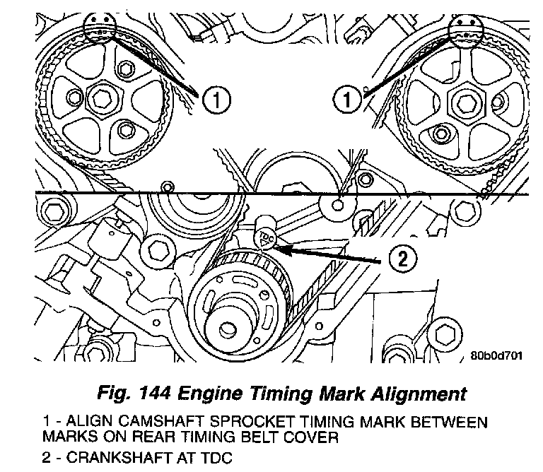2. Align the camshaft sprockets (to reference mark made upon removal) between the marks on the rear covers (Fig. 144).