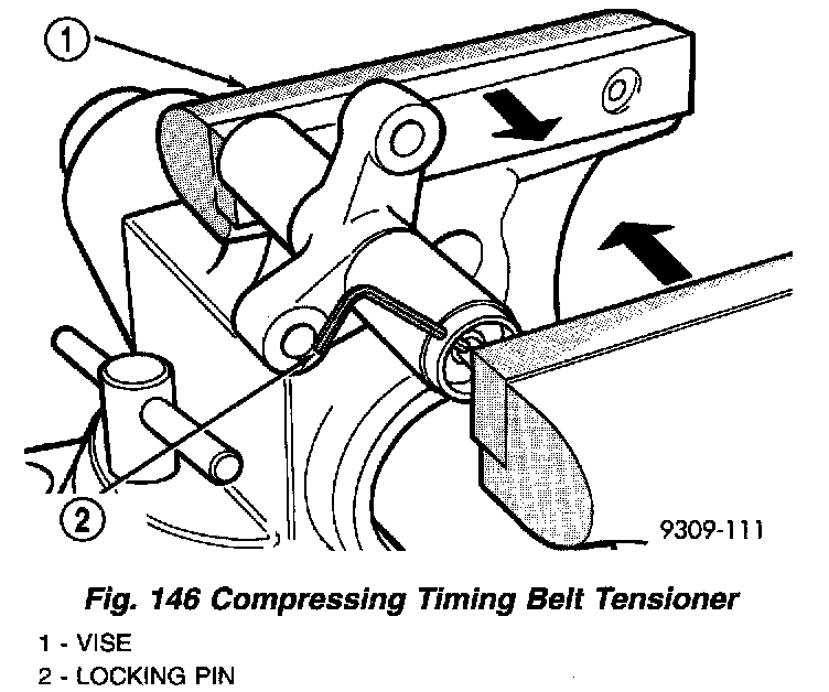 10. Place the tensioner into a vise and SLOWLY compress the plunger (Fig. 146). Total bleed down of tensioner should take about 5 minutes.