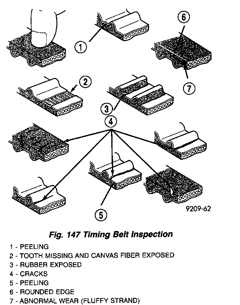 3. Inspect both sides of the timing belt. Replace belt if any of the following conditions exist (Fig. 147):