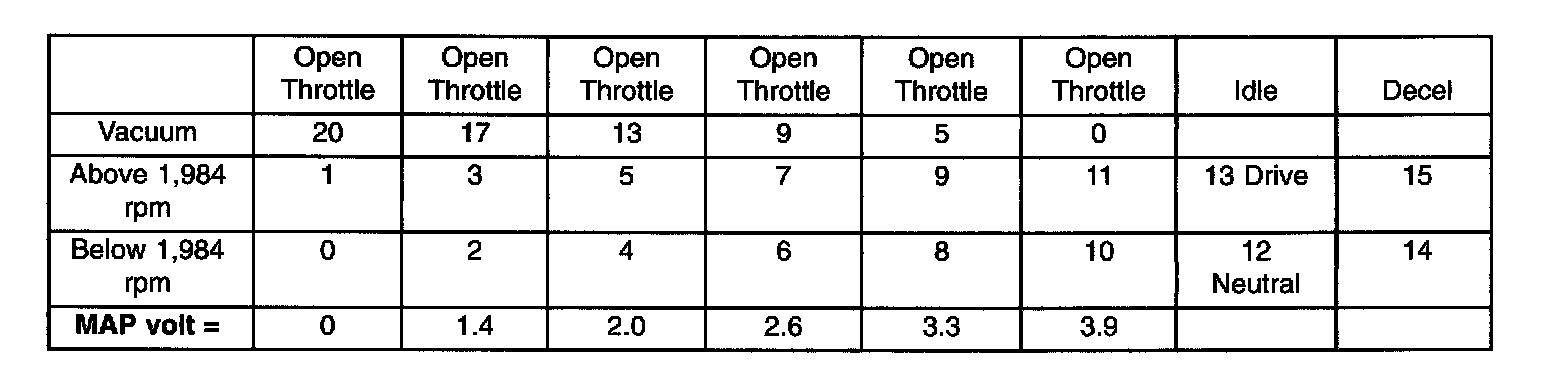 The number of cells varies upon the driving conditions. Two cells are used only during idle, based upon TPS and Park/Neutral switch inputs. There may be two other cells used for deceleration, based on TPS, engine rpm, and vehicle speed. The other twelve cells represent a manifold pressure and an rpm range. Six of the cells are high rpm and the other six are low rpm. Each of these cells is a specific MAP voltage range.