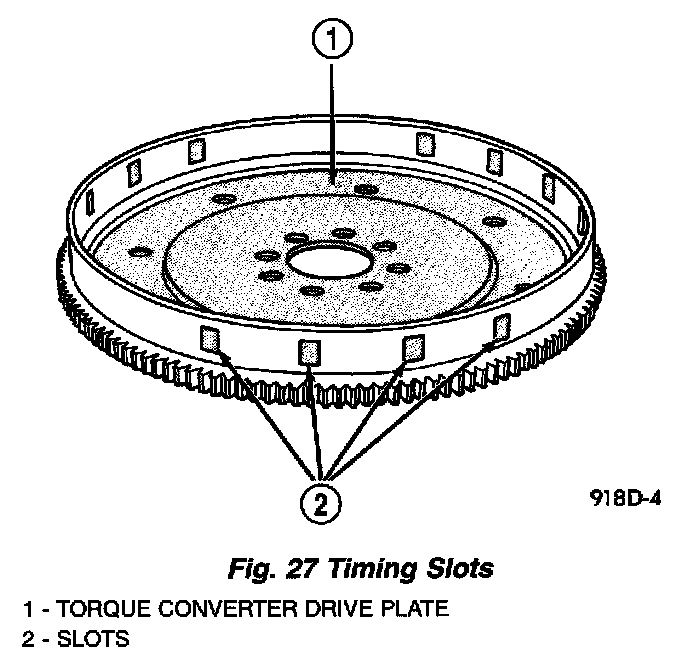 The crankshaft position sensor detects slots cut into the transmission driveplate extension. There are 3 sets of slots. Two sets contain 4 slots and one set contains 5 slots, for a total of 13 slots. Basic timing is set by the position of the last slot. Once the Powertrain Control Module (PCM) senses the last slot, it determines which piston will be next at TDC from the camshaft position sensor input. It may take the PCM one engine revolution to determine crankshaft position.