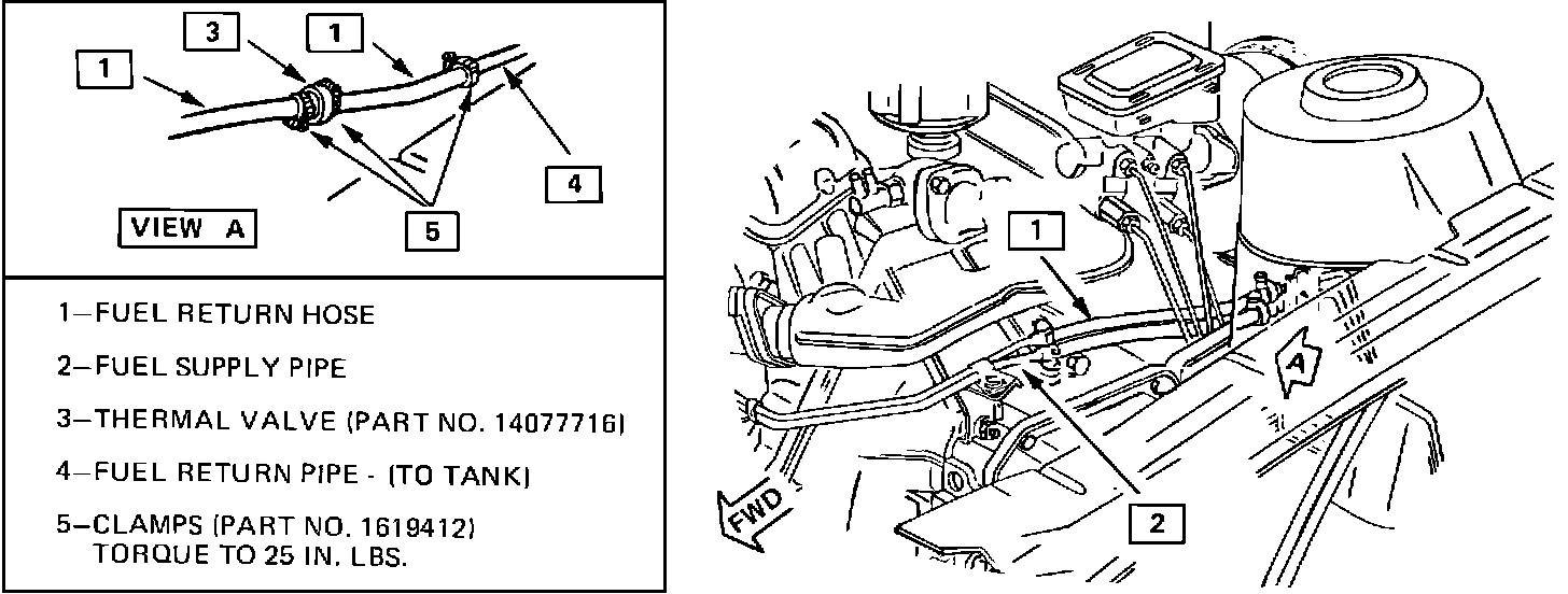 To alleviate this condition, install a thermal disc valve (part number 14077716) in series with the fuel return line. The thermal disc valve closes off the fuel return line in ambients below 60~F (15.5~C) and when warm, it opens to a restricted orifice of .060 in. (1.5 mm). The valve must be installed in the correct direction and, therefore, is labeled with "tank", which should go towards the fuel tank and "pump", which should go towards the fuel pump.