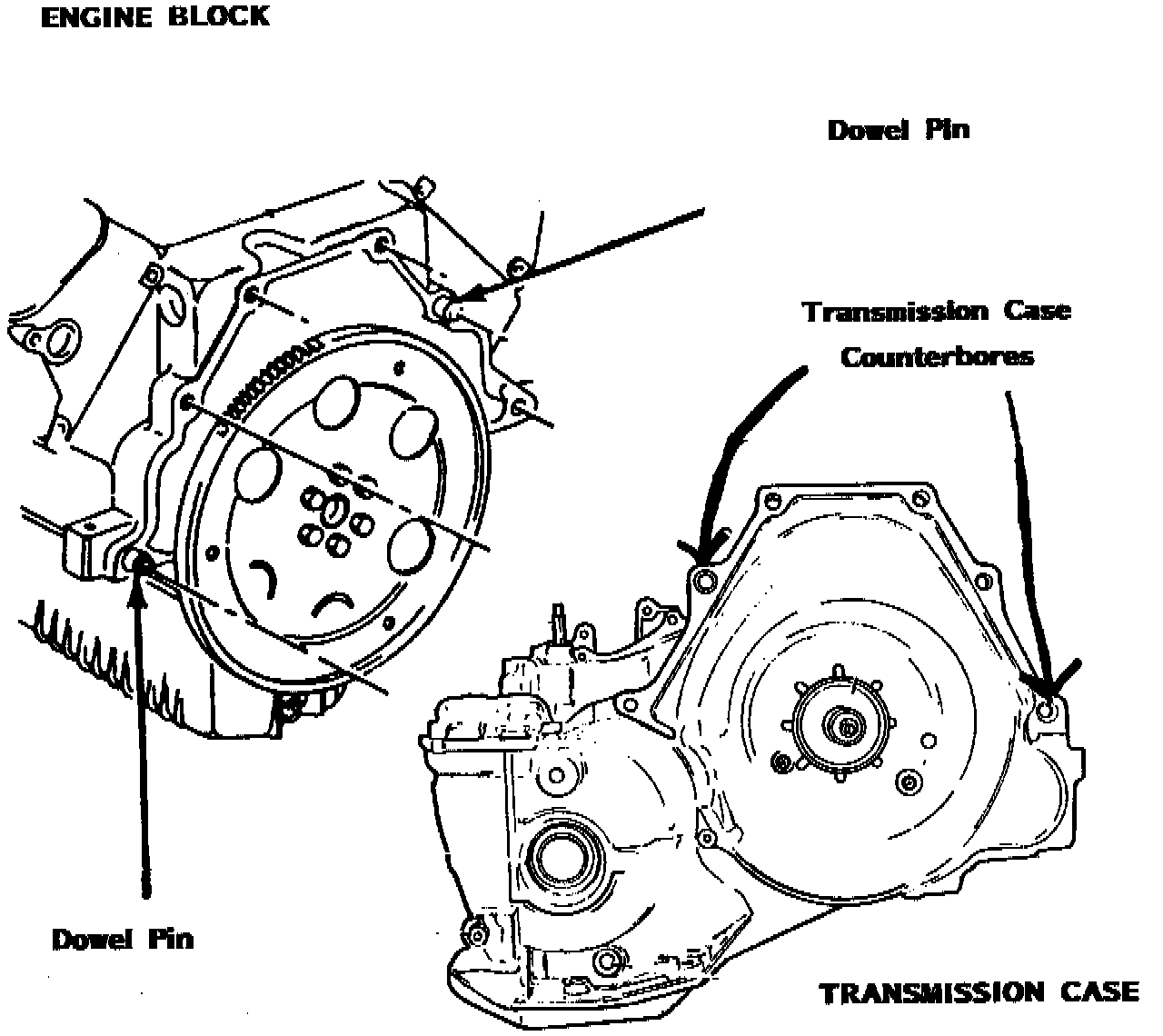5. Inspect the transmission case for deformation in both locating counterbores. Repair any deformation by lightly filing or scraping the counterbores to insure proper engagement of the engine block locating pins. The transmission counterbores are precision locating holes. Excessive metal removal will result in engine-transmission misalignment, and repeated flexplate cracking. If counterbore deformation is excessive and cannot be repaired, then installation of a different transmission case is necessary.