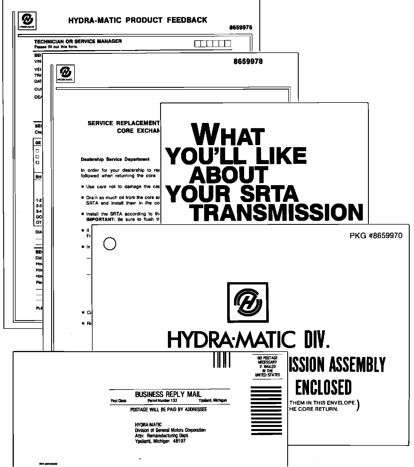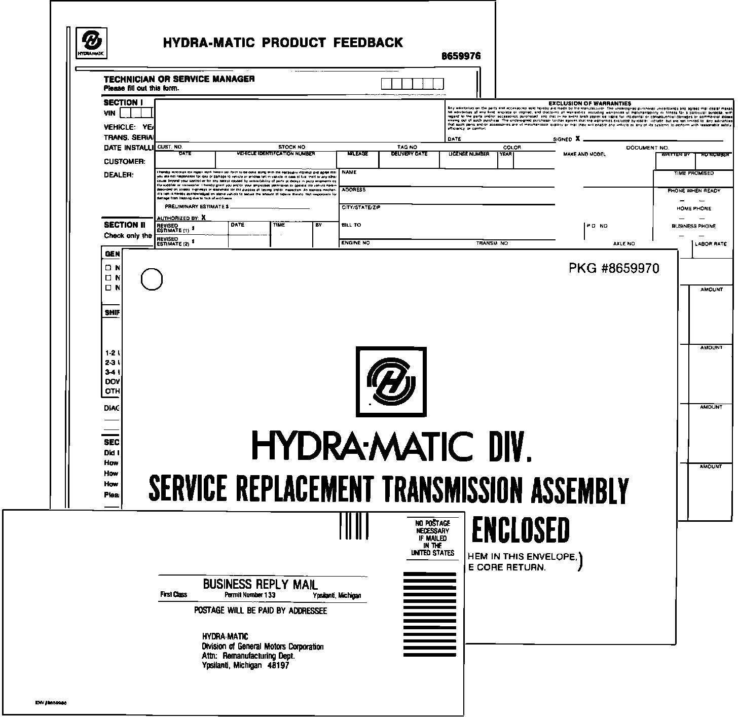 This Product Feedback Form is to be completed by the service manager and/or technician. Fill out the form as completely as possible to provide information which can be used for analysis. This valuable input can result in future product refinement through corrective action. Insert the white copy of the completed form and a copy of the repair order into the SRTA Information Packet envelope, reseal the envelope and wire tag it to the bellhousing of the unit being returned for core exchange. Return the yellow copy of the completed Product Feedback Form, using the post paid envelope, to Hydra-matic Division.