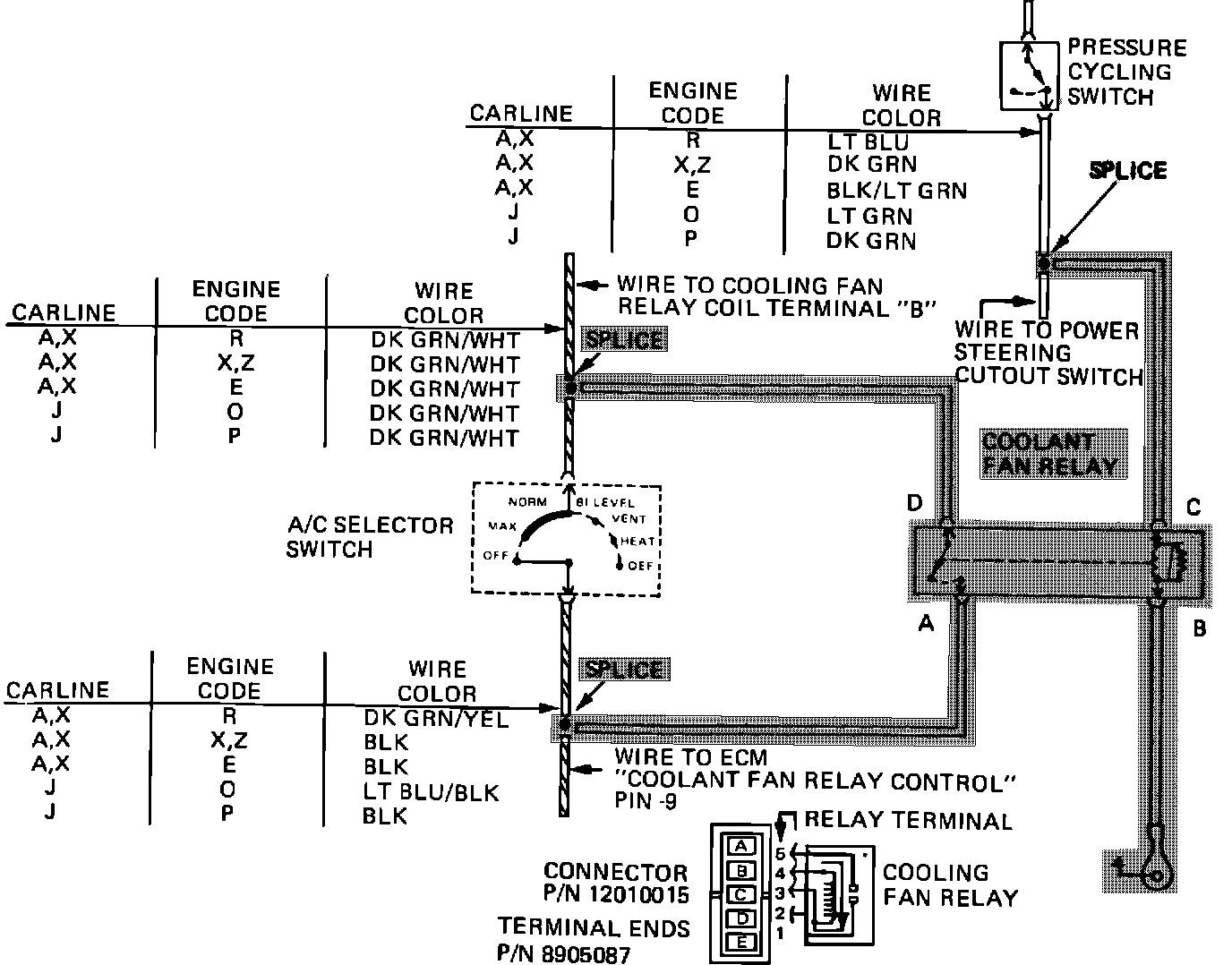 A connector body, Part Number 12010015 and terminal ends, Part Number 8905087 are available through WDDGM for simplification of the installation of the additional cooling fan relay.