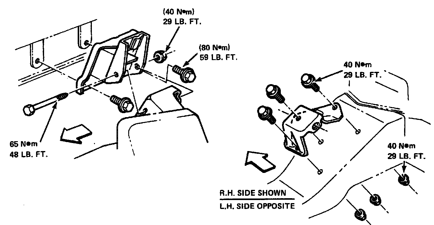 2. It may be necessary to alternately raise and lower transmission to fit motor mount through-bolts into position. Install through-bolt nuts and torque to specifications.