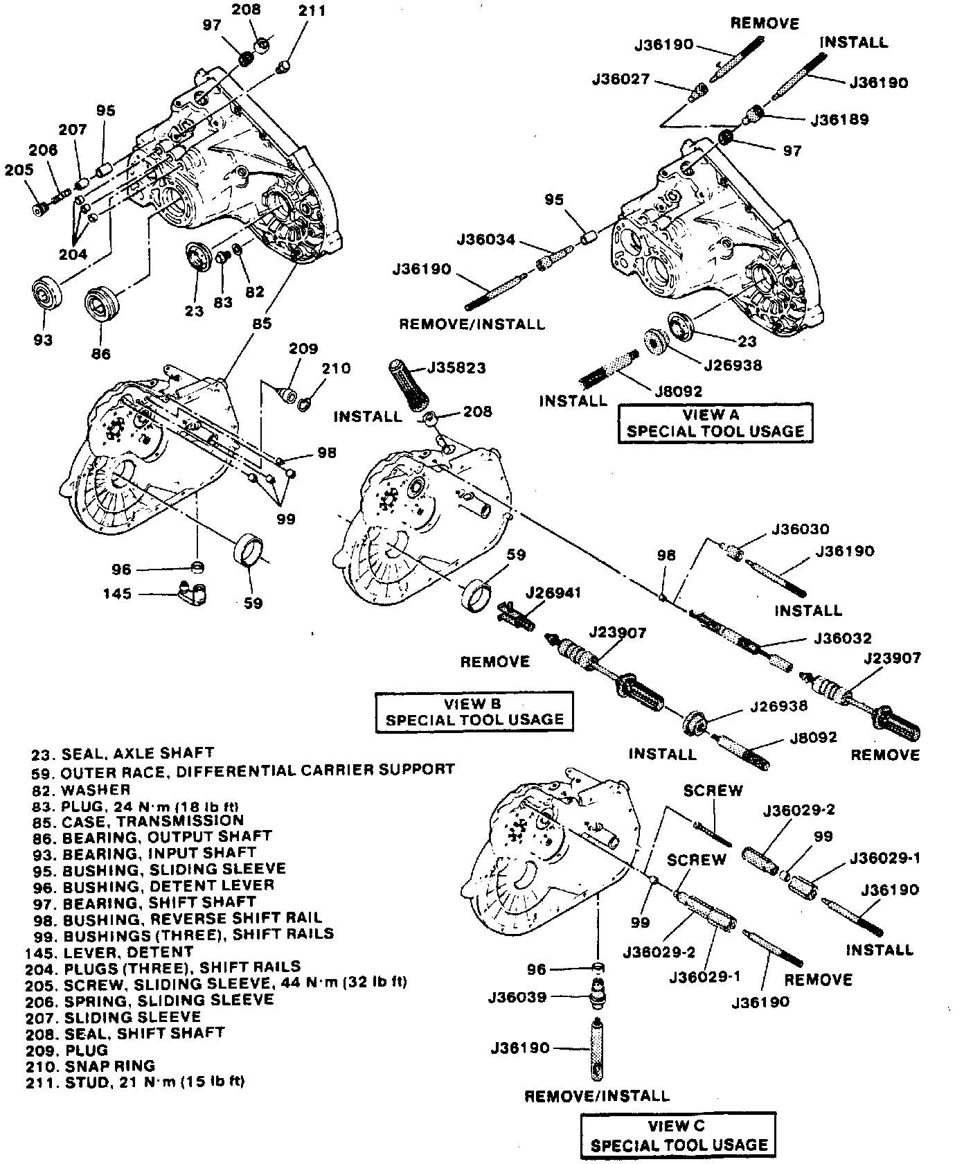 12. Remove bushings (99), shift rail, using tools J-36029 (small end of second adapter in bushing) and J-36190 view C, see accompanying image.)