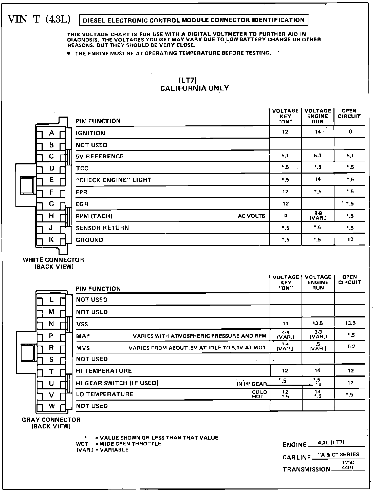 Fig. 076 - ECM Connector Terminal Identification & Voltage Specifications: