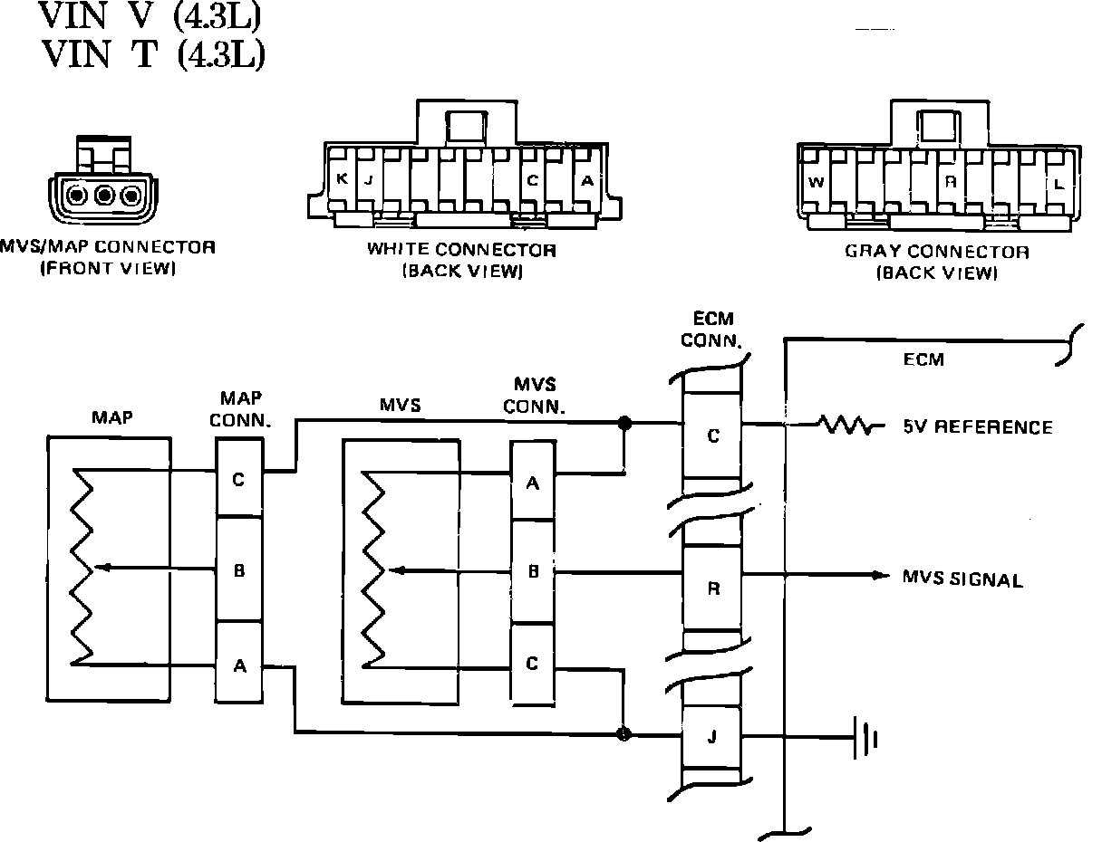 4. Checks for a faulty ECM or faulty wire to MVS connector Terminal "B". Normal voltage at ECM with MVS harness disconnected will be about 5 volts. Low voltage indicates a grounded wire or faulty ECM connection or ECM.