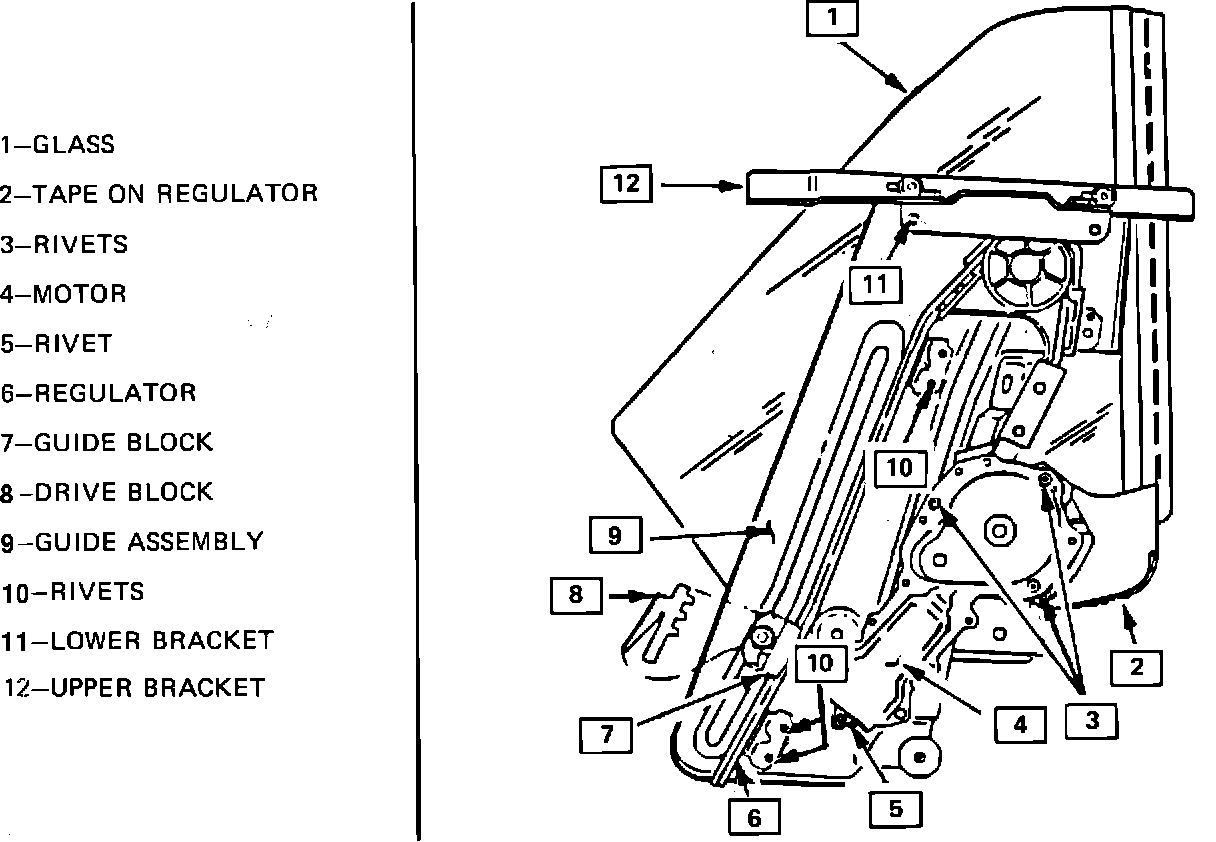 Step 1 Install motor to quarter glass assembly using a rivet gun and 5/32" diameter x 5/8" long rivets to replace rivets (Item 3, Figure 1) and a 1/4" diameter x 1/2" long rivet to replace rivet (Item 5, Figure 1).