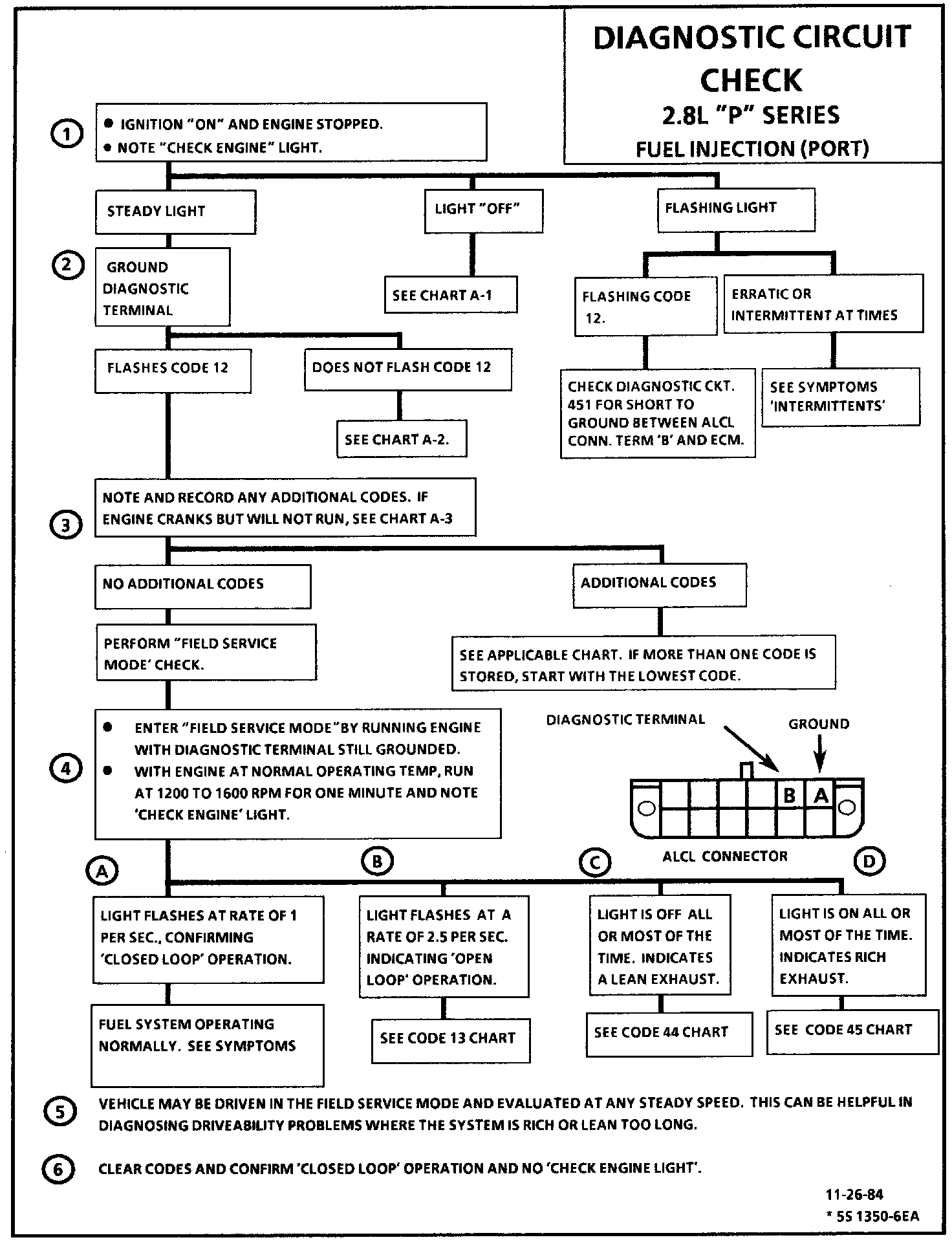 With the engine running and the diagnostic terminal grounded, the ECM will respond to the Oxygen sensor signal voltage and use the "CHECK ENGINE" light to display this information as follows: