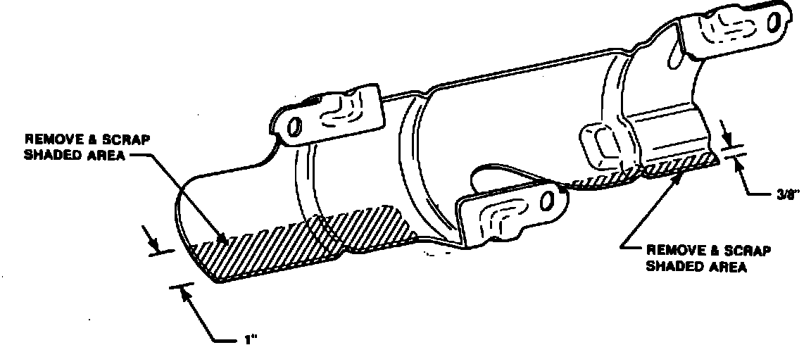 r. Modify (ILLUSTRATION F) and install outer manifold heat shield (dimensions for modification on illustration).