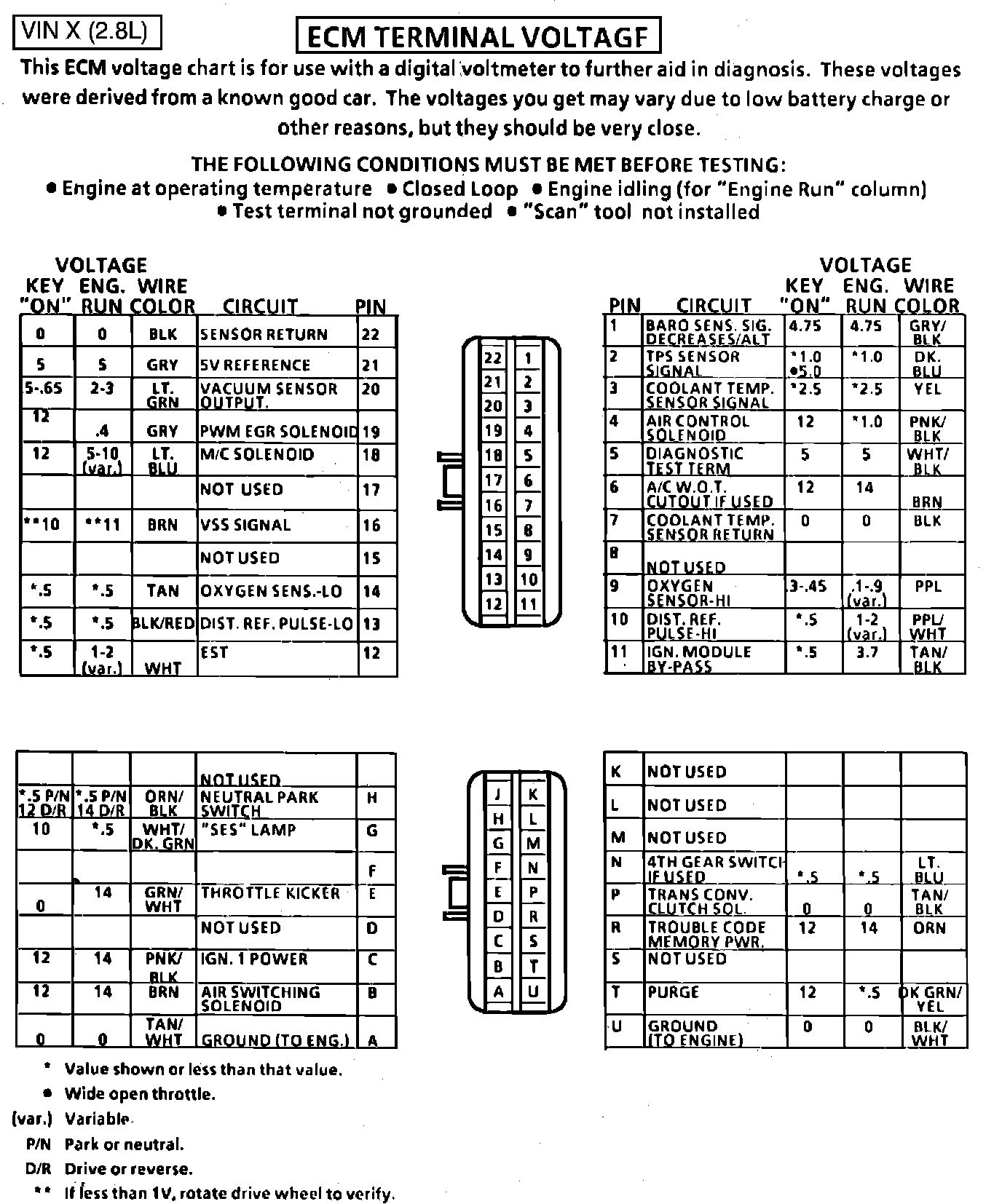 Fig. 049 - ECM Connector Terminal Identification & Voltage Specifications.: