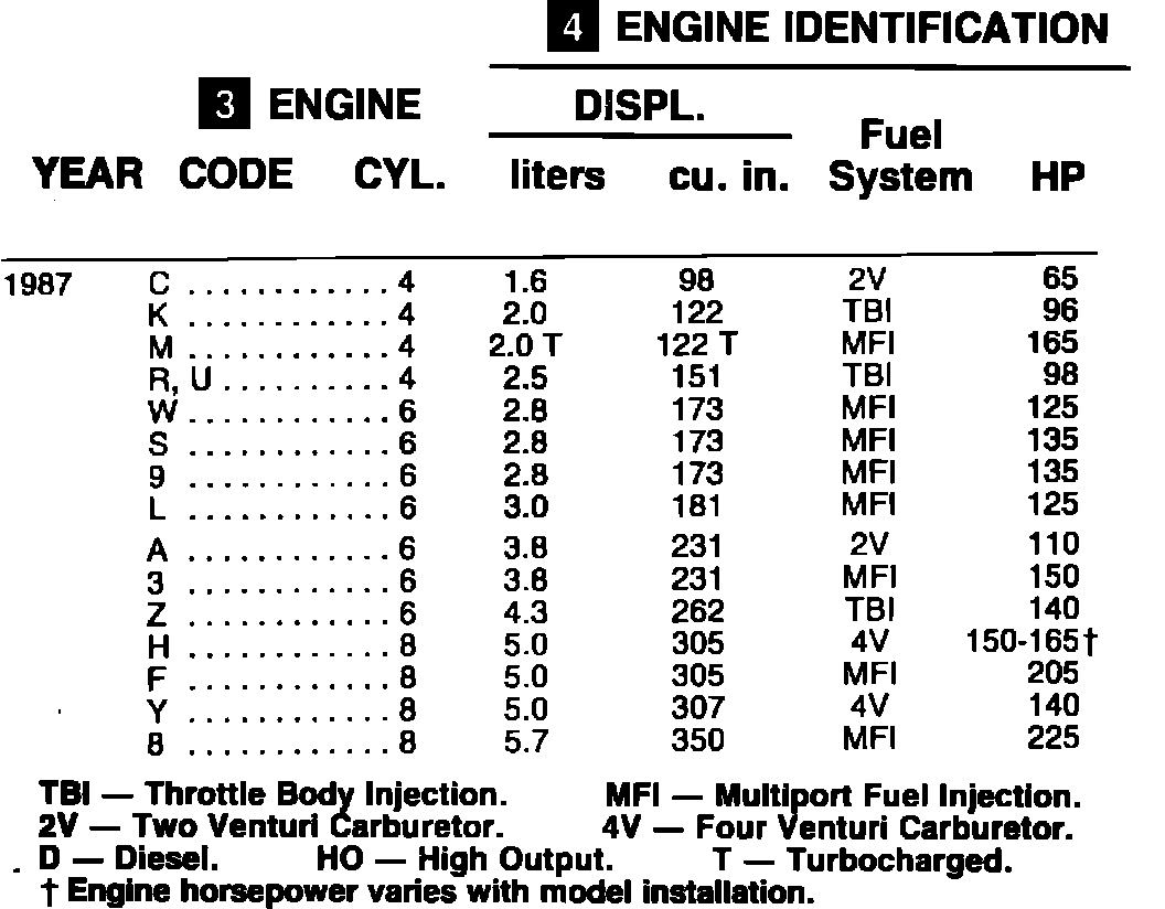 4 - ENGINE IDENTIFICATION: On the line where the engine code appears, read to the right to identify the engine.