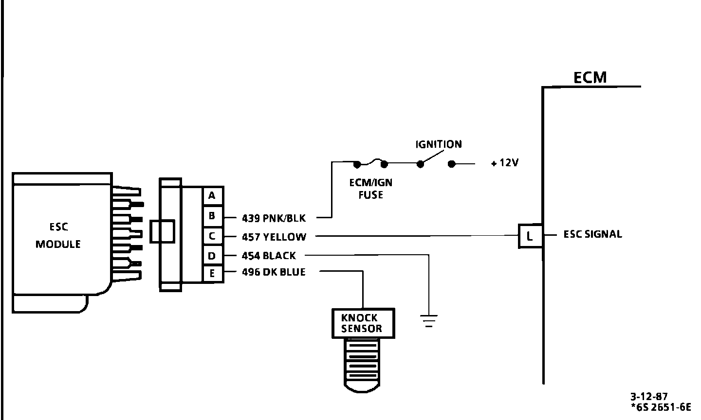 4. "Service Engine Soon" light should be "on" and a Code 43 set because ESC system would be retarded too long. If no light comes on, the ECM is not retarding the spark because of a voltage on CKT 457 to terminal "L" or the ECM is faulty.