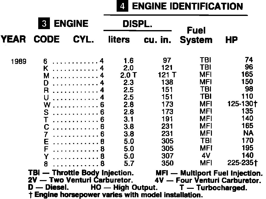 4 - ENGINE IDENTIFICATION: On the line where the engine code appears, read to the right to identify the engine.