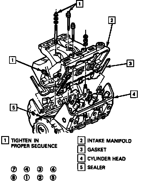 b. Torque intake manifold attaching bolts to 15 ft. lbs. in sequence shown in Fig. 3, then retighten to 24 ft. lbs. in sequence shown in Fig. 3.