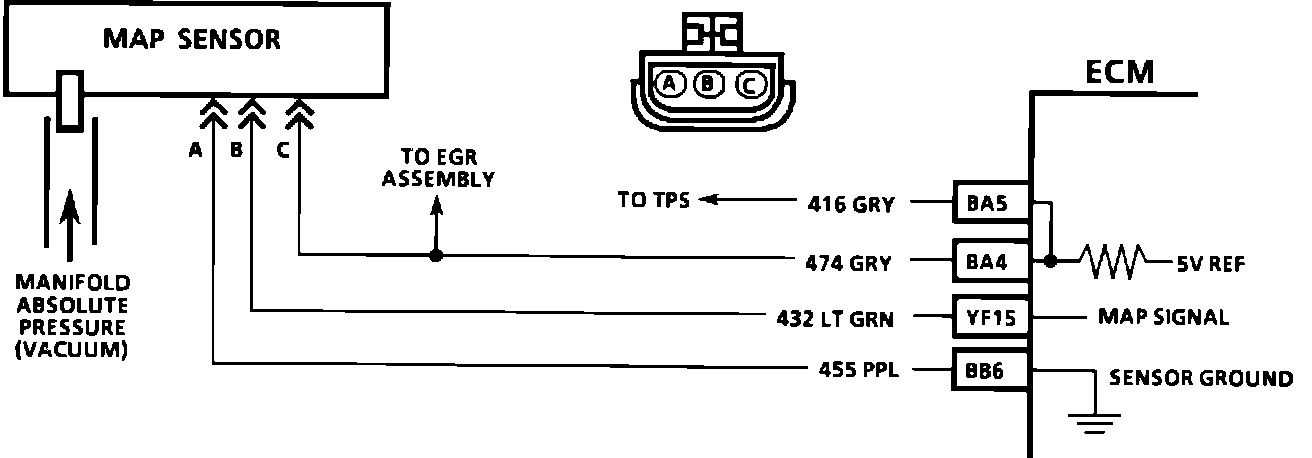 The manifold absolute pressure sensor (MAP) measures manifold pressure (vacuum) and sends that signal to the ECM. The MAP sensor is mainly used for fuel calculation when the ECM is running in the throttle body backup mode. The MAP sensor is also used to determine the barometric pressure and to help calculate fuel delivery.