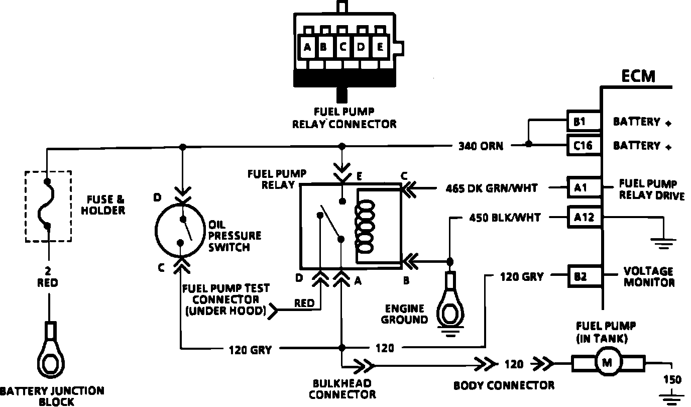 The oil pressure switch is mounted on the engine. This switch operates as a parallel power supply with the fuel pump relay to supply battery voltage to the fuel pump. Voltage is supplied to the fuel pump after approximately 28 kPa (4 PSI) oil pressure is reached.