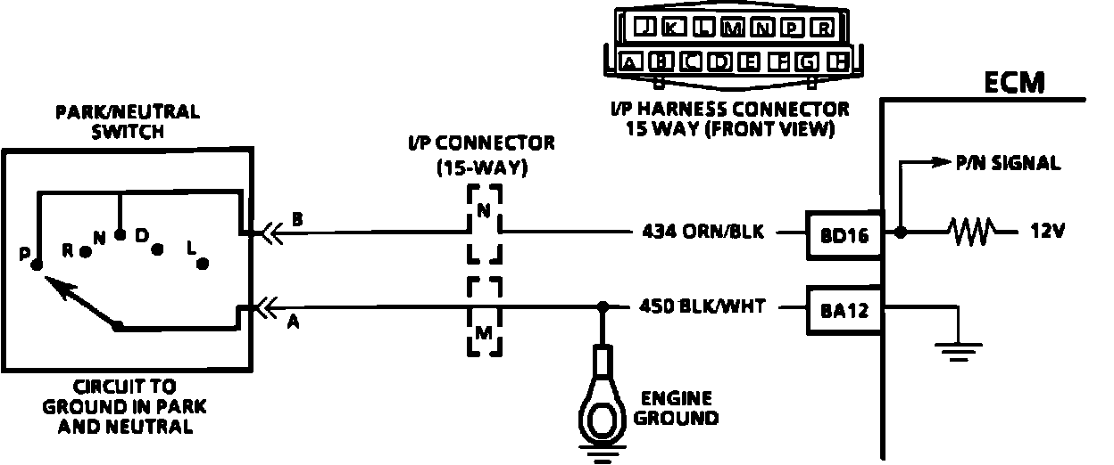 The PARK/NEUTRAL Switch contacts are closed to ground in park or neutral and open in drive ranges. The ECM supplies ignition voltage through a current limiting resistor to circuit 434, and senses a closed switch when the voltage on circuit 434 drops to less than one volt. The ECM uses the P/N signal as one of the inputs to control idle air, vehicle speed sensor diagnostics, and exhaust gas recirculation. If circuit 434 indicates a grounded P/N switch, while in the drive range, the EGR would be inoperative and engine detonation may result. If circuit 434 always indicates drive (open), a drop in idle speed may exist when the gear selector is moved into the drive range.