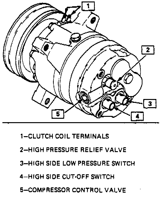 The V-5 compressor is driven by a serpentine belt from the engine crankshaft through the compressor clutch pulley. The compressor pulley rotates freely, without turning the compressor shaft, until an electromagnetic clutch coil is energized. When voltage is applied to energize the clutch coil, a clutch plate and hub assembly is drawn rearward toward the pulley. The magnetic force locks the clutch plate and pulley together as one unit to drive the compressor shaft.