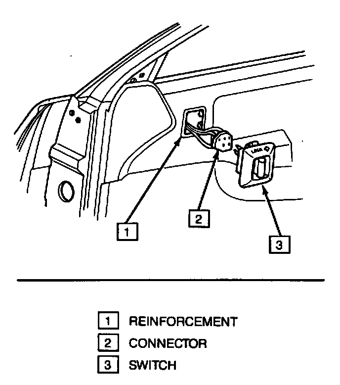 Release switch spring clip from trim panel by inserting a thin bladed tool between top of switch and trim panel reinforcement (1) and remove switch (3).