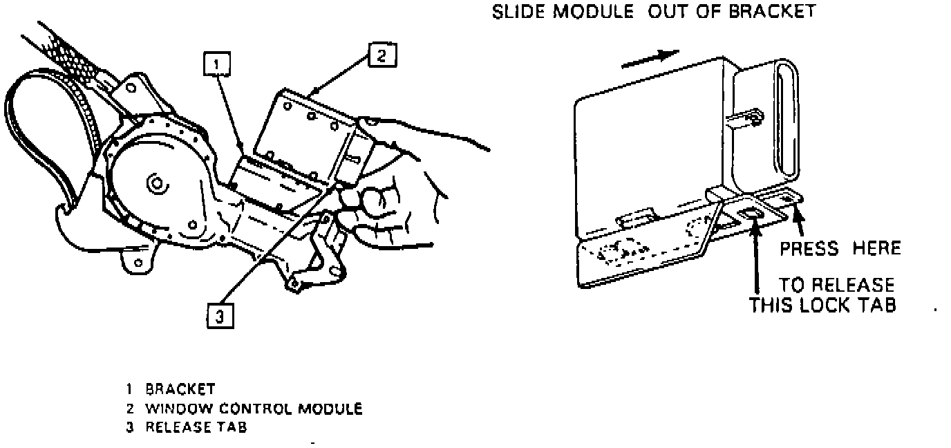 4. Depress the release tab on the lower edge of the express down module and pull the module toward the front of the vehicle. The module will move about 3/8" before the mounting stud on the module contacts the front of the slot in the mounting bracket. Disengage the module from the mounting bracket by tilting the module outward (away from the inner door). See Illustration.