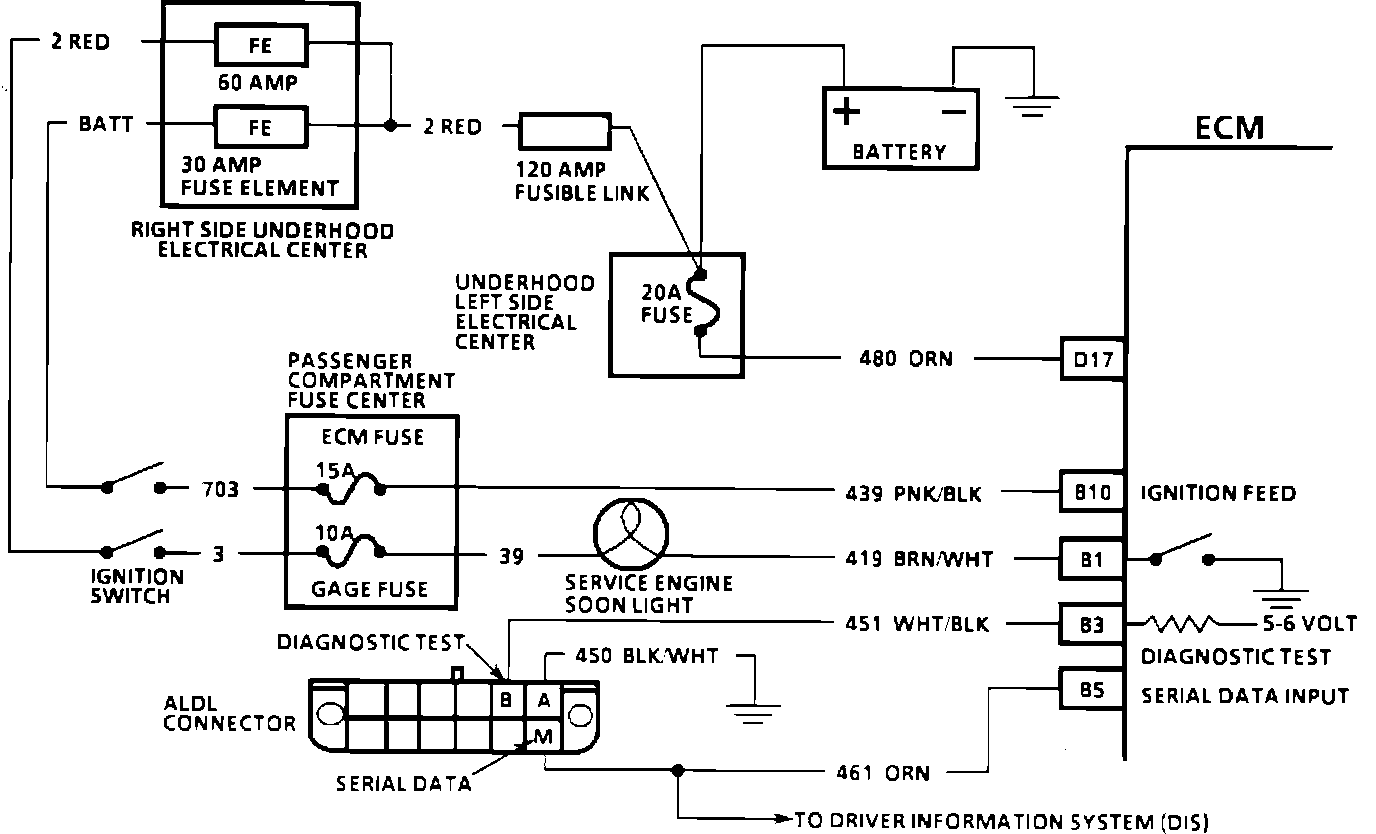 There should always be a steady "SERVICE ENGINE SOON" light when the ignition is "ON" and engine stopped. Battery voltage is supplied directly to the light bulb. The electronic control module (ECM) will control the light and turn it "ON" by providing a ground path through CKT 419 to the ECM.