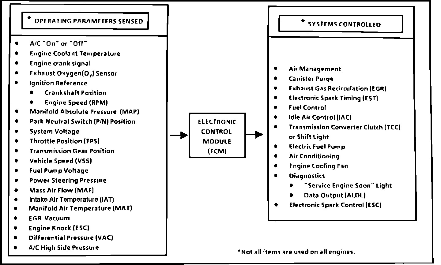 The Computer Command Control System has an Electronic Control Module (ECM). The computer system, through this module, can monitor a number of engine and vehicle operating functions which control the following systems: