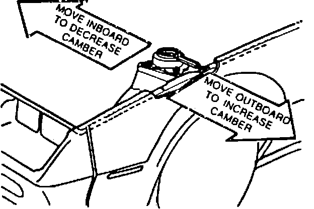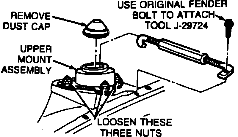 Camber adjustments are made by moving the position of the upper strut mount assembly, Fig. 3. To make adjustment, remove dust cap and fender bolt and attach tool J-29724 to original fender bolt, Fig. 2. Tighten the turnbuckle and loosen the three strut mount attaching nuts.